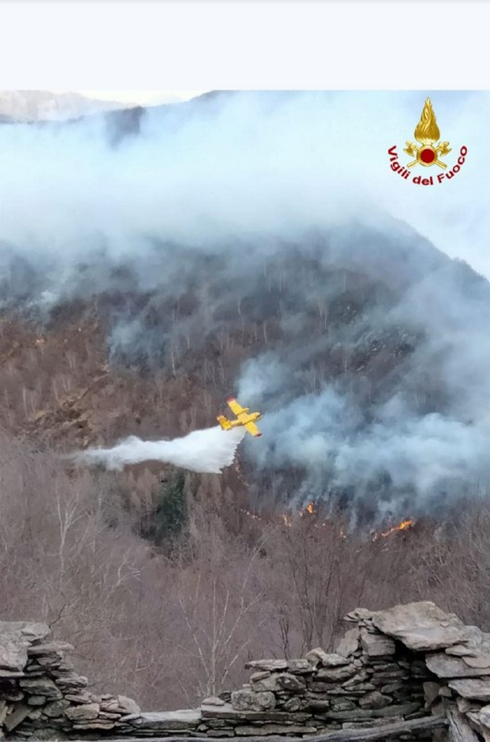 GURRO - 01-02-2022 -- Sono proseguite per tutta la notte le operazioni di spegnimento dell’incendio boschivo scoppiato ieri mattina in Val Cannobina, sopra l’abitato di Gurro. I vigili del fuoco del comando provinciale e i volontari Aib hanno dispiegato una settantina di uomini, coadiuvati da due Canadair, per contenere i diversi roghi innnestatisi nella zona vicina all’alpe Piazza. Le fiamme hanno minacciato alcune baite dell’alpeggio che, per fortuna, sono rimasti indenni dal fuoco.