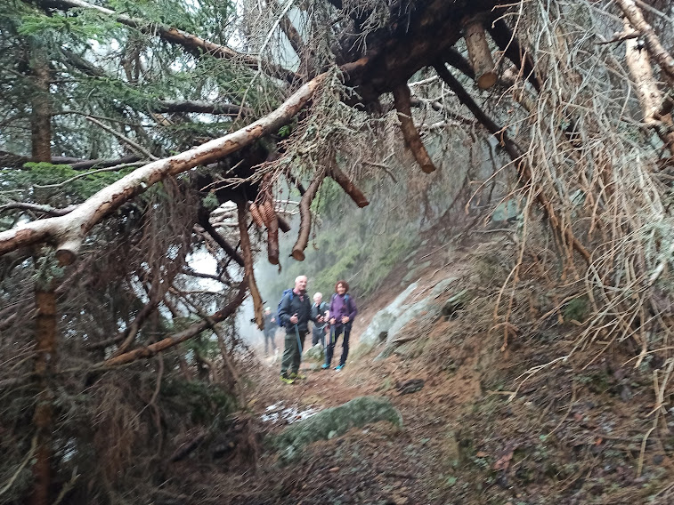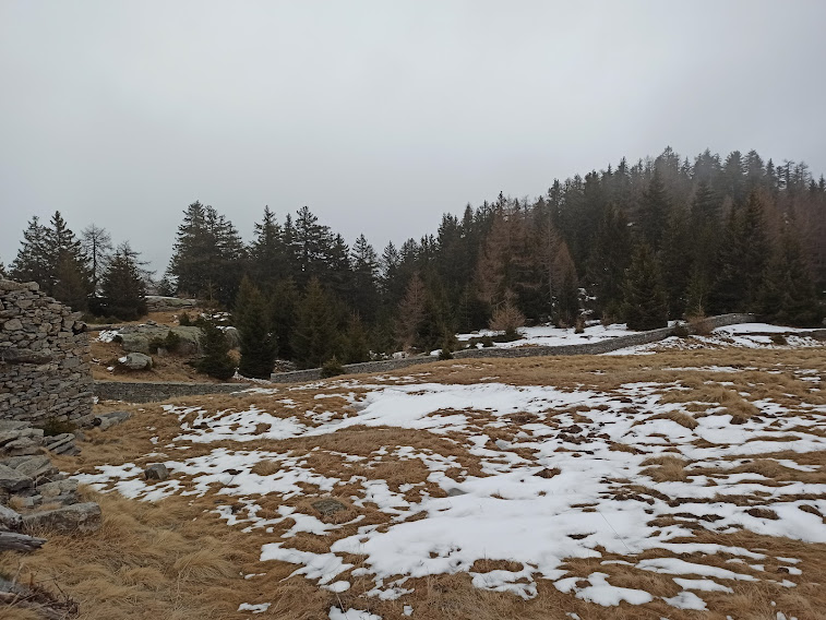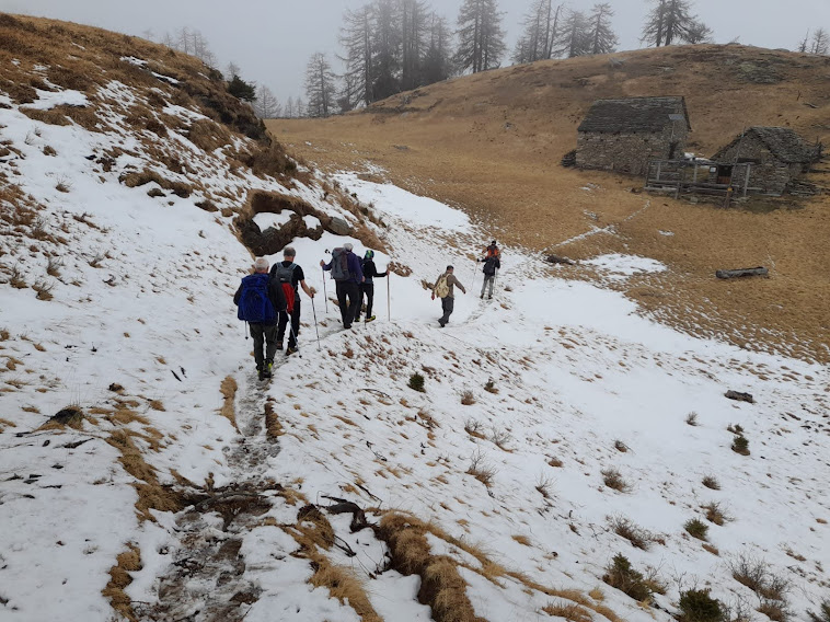 Con la consueta pazienza la forte badante porta a spasso sette anziani lungo i sentieri della Colmine di Crevoladossola. La giornata inizia un’ora prima per lo scrivente e per uno dei nostri medici di turno che è anche il progettista dell’escursione odierna. Portiamo un’auto in località Montaiou, presso l’Alpe Baratta, a quota 1300 circa. Siamo sulla strada che da Varzo sale all’Alpe Solcio passando da Coggia e Dreuza. Con la seconda auto scendiamo al bar Gufo’s, in frazione Pontetto di Montecrestese, per l’appuntamento con i verbanesi. Non è finita! Risaliamo, questa volta sulla strada verso l’Alpe Gorta, sotto la Colmine, e parcheggiamo alla palestra di roccia La Valletta, quota 760. I due autisti sono già quasi stanchi e all’arrivo sarà la stessa storia. Nuvoloso, ma asciutto, ahimè!. Non vedremo uno sprazzo di sole né una goccia di pioggia per tutto il giorno. Lungo la strada asfaltata arriviamo alla Cappella di Puzöi, 798. Seguiamo ancora la strada per un breve tratto ed imbocchiamo il sentiero A09 evidente sulla sinistra. Alle baite di Ceva di Sotto, 980, la prima breve pausa. A Ceva di Sopra, 1050, torniamo sulla strada, ma l’abbandoniamo quasi subito tenendoci a destra per una breve variante consigliata da un profondo conoscitore della zona. Infatti, allungando di poco il percorso, si prospetta la grande occasione di incontrare dei camosci che spesso soggiornano dalle parti dell’Alpe Ginestrin. Dopo una bella baita, direi villa, un ripido e breve canalino, dove si trovano delle cordine utili in caso di neve o ghiaccio, immette in una radura dove non c’è traccia degli ungulati previsti. Ritroviamo la strada, in questo tratto molto ripida, a quota 1100 e la seguiamo fino alle prime baite di Gorta, 1300, e a quelle più alte, 1330. Lasciamo la strada che sale all’Alpe La Prasca e torniamo sul sentiero A09 per un tratto pianeggiante, con baratro sulla sinistra, che conduce ad un breve strappo e ad un’incantevole valletta. Alla nostra destra c’è il sentiero che sale all'Alpe La Prasca. Noi saliamo a sinistra alla Colmine, 1702, che raggiungiamo dopo due ore e venti minuti dalla partenza, soste escluse. Non c’è più l’albero colpito dal fulmine con un grande buco alla base che formava una suggestiva cornice in cui ci si faceva fotografare con la piana dell’Ossola come sfondo. Presso il Bivacco Colmine, dedicato all’Alpino Protti Andrea, ci meritiamo una breve pausa. Qui, all’Alpe Colmine di Fuori, comincia la lunga e spettacolare dorsale fra Divedro e Antigorio che confluisce verso nord nord ovest nel massiccio del Cistella. C’è un po’ di neve. Passando dall’Alpe Colmine di Dentro, 1648, ci abbassiamo di un centinaio di metri nel fiabesco bosco di abeti, anch’esso colpito dalle tempeste degli anni scorsi. La risalita morbida, con altri brevi saliscendi, ci porta al bivio per l’Alpe Saborsone e Varzo, alla nostra sinistra. Noi proseguiamo diritti, passiamo dalla Croce di Sasso ed arriviamo all’incantevole Alpe Genuina, 1695, dove pranziamo al freddo, perché oggi del sole non c’è traccia (poco meno di un’ora dalla Colmine). Proseguiamo verso nord, alzandoci subito di qualche decina di metri fino al punto più alto dell’escursione. Di qui si scenderà soltanto, con una certa attenzione perché c’è un po’ di neve, a tratti, ma mai più di una ventina di centimetri. Dopo tre quarti d’ora siamo al Passo della Colmine, 1605. Diritti si proseguirebbe per l’Alpe Solcio, ma noi scendiamo a sinistra sul sentiero sempre evidente e senza più neve. A quota 1480 teniamo la destra verso Dreuza – Varzo, lasciando quella che è anche una pista per ciclisti acrobatici. Troviamo i primi faggi e alle subdole pigne si sostituiscono le ancor più subdole foglie. In meno di tre quarti d’ora siamo all’auto parcheggiata al mattino a quota 1300. Dopo quasi un’ora torniamo a recuperare gli altri che, nel frattempo, sono arrivati a piedi a Coggia, 820, dopo sedici chilometri di cammino.