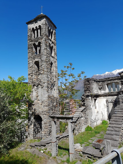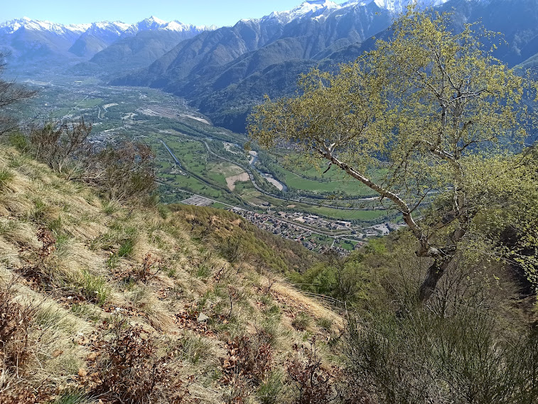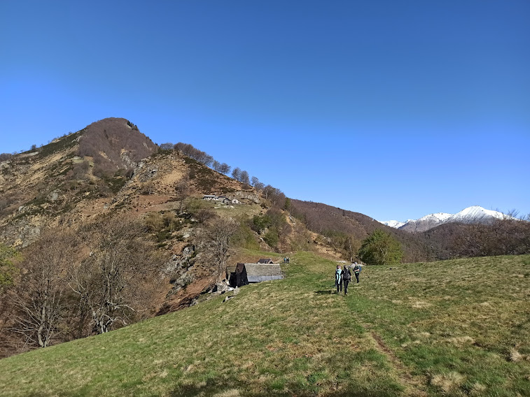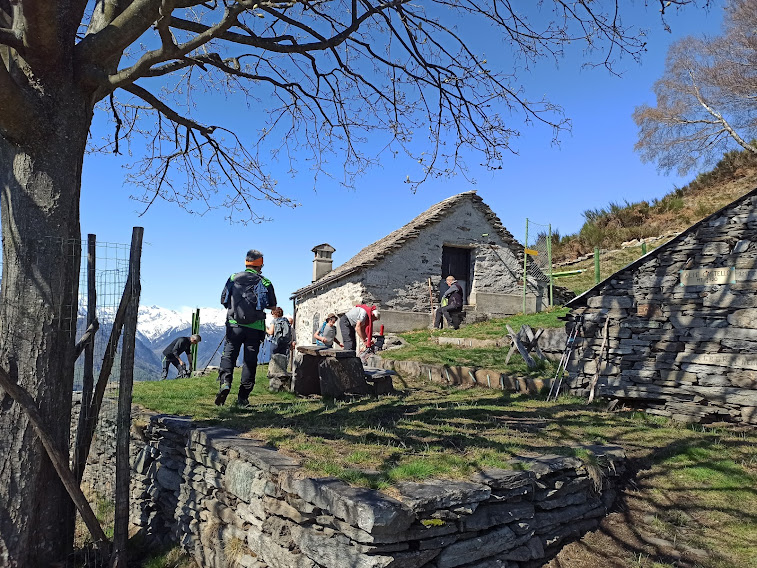 In questo tratto, esposto a nord ovest, troviamo effettivamente qualche centimetro di neve che serve soltanto ad alzare il livello delle nostre burle infantili. Sui due comodi tavoli esterni di sasso ripristiniamo le energie al caldo sole di fine aprile. Puntiamo poi su Villadossola, passando dall’Alpe Baldana, 1215, dall’Alpe Vancone, 988, incrociando la strada asfaltata e raggiungendo l’Alpe Corticcio, 784. Fino a qui il sentiero evidente è anche pulito.