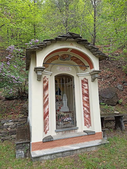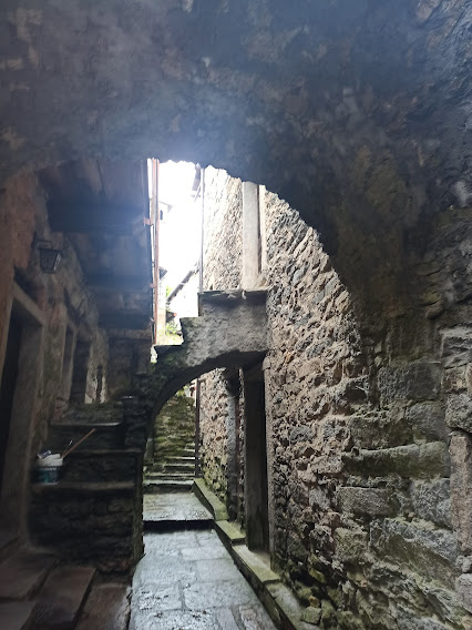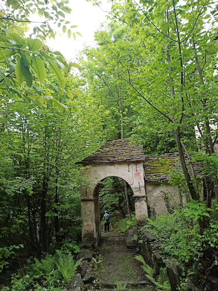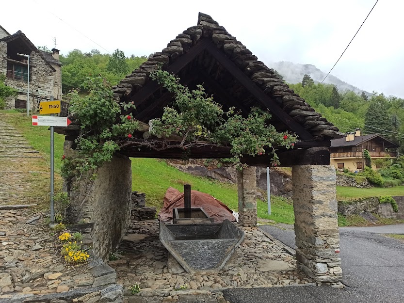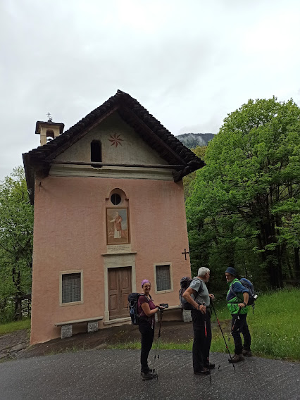 Al primo tornante attraversiamo un prato per portarci sulla bella mulattiera che sale dal centro e così, saggezza a parte, siamo subito a bagno. Gli scarponi “da neve” non pensavamo servissero sui sentieri di Crevoladossola, ma avevamo fatto i conti senza la guida. Arriviamo a Ternaro, passiamo Borgo dell’Era e ci fermiamo brevemente all’Oratorio dei Santissimi Carlo, Rocco e Sebastiano a Pinone. Adesso non piove.