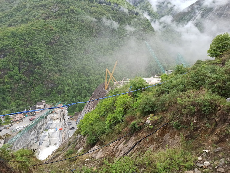 Siamo solo in quattro e, nonostante l’assenza della titolare, c’è un’ormai indispensabile giovane badante a sostituirla. Fortunatamente per lei uno dei tre maschietti è quasi giovane, ma gli altri due sono un anziano grafomane e un vecchio ex alpinista in perenne sofferenza, che oggi ci guiderà. Da quota 380 seguiamo la strada che sale alle frazioni alte di Crevoladossola, via Danda, ormai occupata a tempo pieno dai camion provenienti dalla cava di Villa dell’Oro. La saggia guida dice che, rimanendo sull’asfalto, eviteremo di bagnarci. Pioviggina.