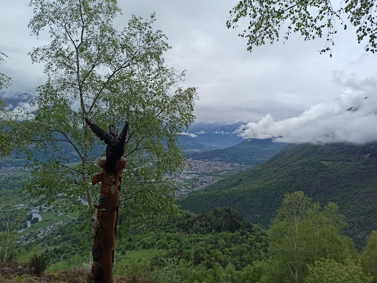 Proseguiamo sulla mulattiera e passiamo al disopra della ciclopica cava, dove ferve l’attività. Raggiungiamo l’Oratorio di San Bernardo e Enso, dove un amico sta facendo giardinaggio e passiamo ad ossequiarlo. Torniamo verso il capoluogo lungo la strada asfaltata fino al bivio per Simbo, dove, sempre su asfalto, teniamo la sinistra. Cominciamo ad ammirare sculture in legno su ceppi e su tronchi in buona salute, ai quali spero l’arte non faccia male. Ne troveremo moltissimi per tutta la durata dell’escursione e siamo realmente ammirati per il tempo dedicato da un artista a questa attività e per la bellezza di alcune opere in particolare.