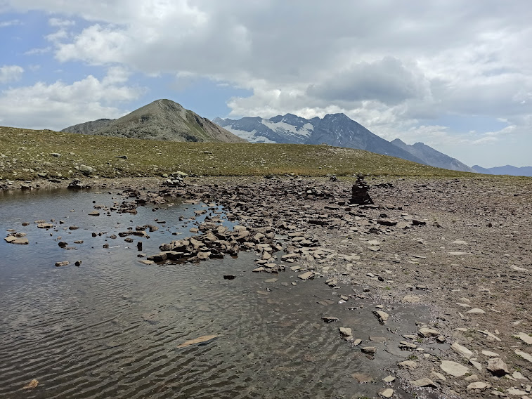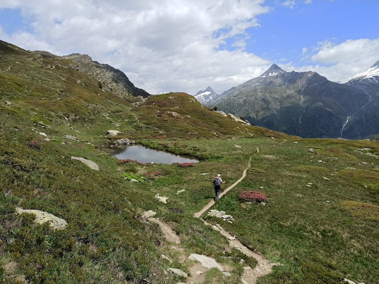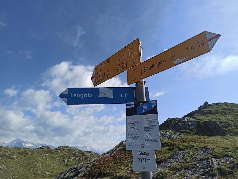 Torniamo rapidamente sui nostri passi fino ad un piccolo specchio d’acqua quasi asciutto, riparato dal vento, poco sopra il laghetto Undre Rossusee, costeggiato prima. Durante la pausa ci raggiungono anche due gocce portate dal vento, ma prevale il sole. Lungo l’evidente e battutissimo sentiero verso oriente torniamo al Passo del Sempione (due ore da Nanzlicke) e ci rituffiamo nella calura del fondovalle.