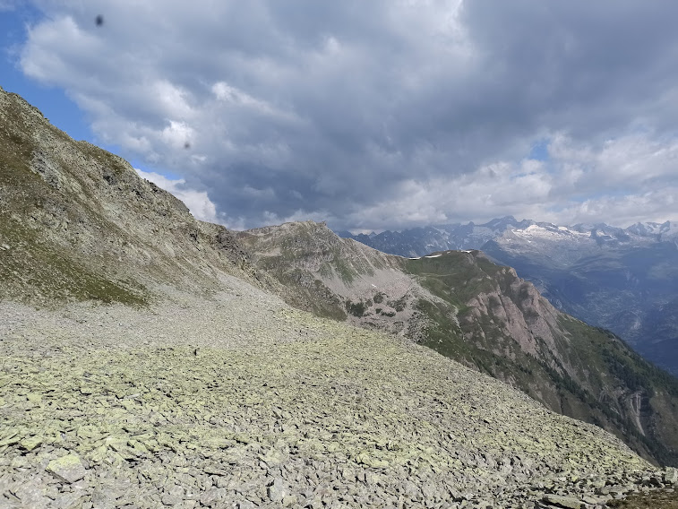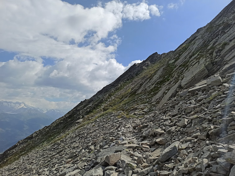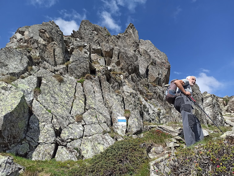 Con il ritardo causato dalla strage di neuroni nel cervello di un ultrasettantenne capisco che siamo su un percorso per biciclette, dell’UIC ( Union Internationale des Cyclogrimpeurs), come vedo osservando con più attenzione la foto che avevo scattato al cartello segnaletico. Si dovrebbe sempre dedicare un po’più di attenzione alla lettura dei cartelli in montagna. Dopo la pietraia quasi pianeggiante una breve risalita ci porta all’inizio del tratto di discesa a tornanti su un versante molto ripido che richiede attenzione anche a piedi.