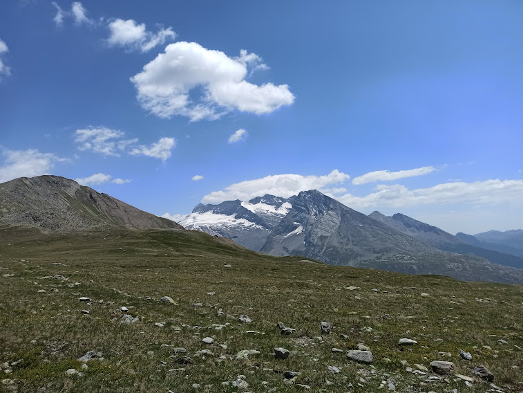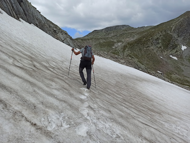 Scendere di qui in bicicletta a me sembra pura follia, ma non me ne intendo. Capisco bene, adesso, le raccomandazioni alla prudenza. Mi ricordo che di qui ero passato qualche decennio fa con l’amico Sergio Novaresi, in senso inverso. Adesso ci siamo abbassati di un centinaio di metri. Ricomincia una morbida risalita, sempre diretti a occidente. Attraversiamo un comodo nevaio e passiamo dalle parti di una baita che dovrebbe essere Lengritz, a quota 2425.