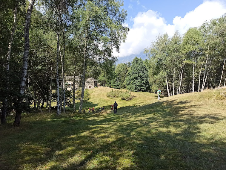 Fa il passo l’anziano ex alpinista che, alla faccia degli acciacchi, mantiene un buon ritmo su queste pendenze severe. Dove iniziano i faggi e il bosco è meno fitto l’aria diventa più respirabile, nonostante il primo sole. In un’ora e un quarto siamo all’Alpe Albarina, 1091, preceduta da una cappella.