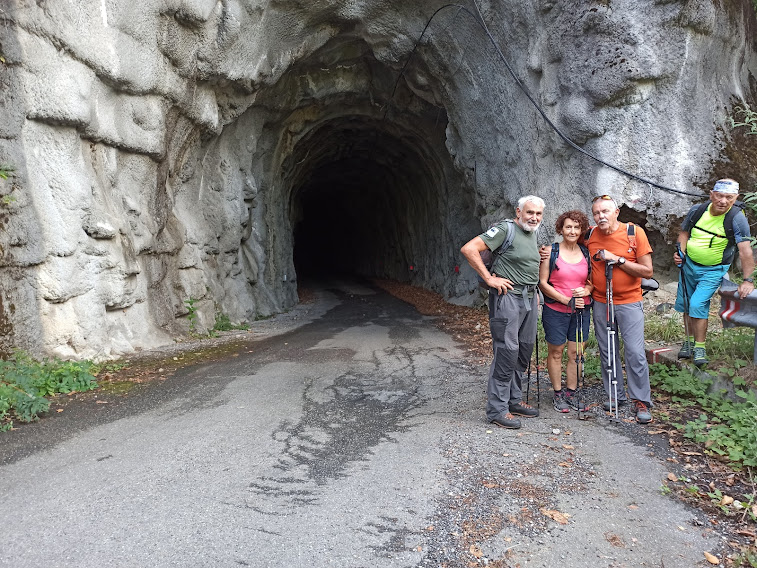 La squadra odierna è guidata dalla badante titolare e dal medico di turno. La seconda badante ci raggiungerà direttamente a tavola, dovendo oggi badare al marito. Del gruppo agonistico fanno parte anche un anziano ex alpinista acciaccato, in lenta ripresa, un quasi giovane runner, anche lui in ripresa, e cinque dipendenti INPS in discreta salute e con grande appetito. La parte bassa del sentiero è in un fitto sottobosco dove afa e umidità fanno sudare in modo indecoroso.