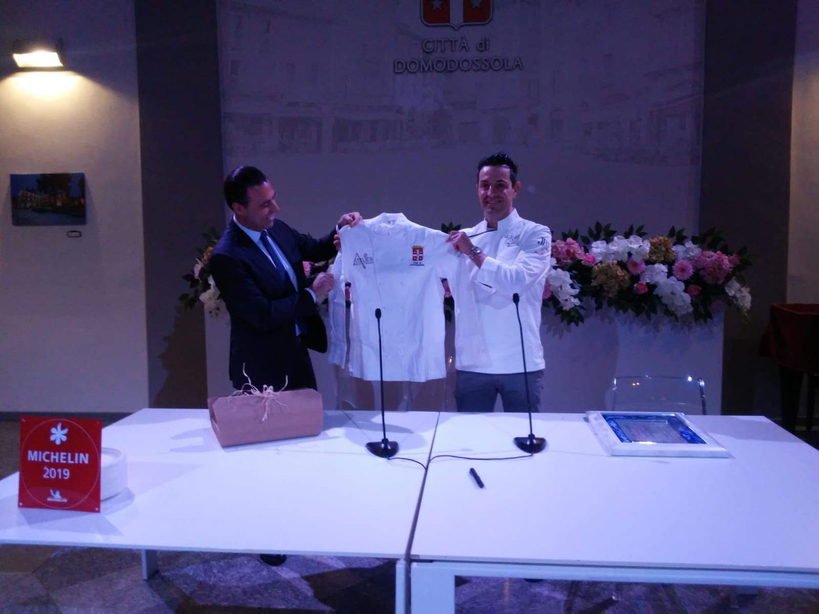 di Domodossola ha celebrato questa sera in Cappella Mellerio la prima stella Michelin ossolana: lo chef Giorgio Bartolucci, titolare del ristorante Atelier a Domodossola. "É il coronamento di un percorso importante a cui si arriva con impegno e professionalitá" ha detto il sindaco Lucio Pizzi che ha omaggiato Bartolucci con una speciale targa e una giacca da chef con il logo della cittá di Domodossola. "Ringrazio in particolare la mia famiglia che é alla base di quello che ho costruito e i miei collaboratori" ha detto lo chef stellato. La serata é proseguita con un ottimo buffet cocktail con le specialità firmate dallo chef stellato.