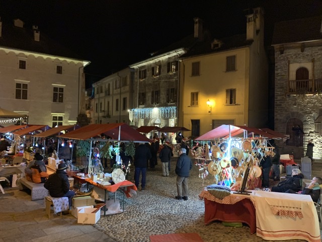 di Natale di Domodossola, giunti alal 22^ edizione. sabato mattina sono stati tanti gli svizzeri che hanno apprezzato le merci esposte sulle 150 bancarelle dal tetto rosso, di cui 30 al "debutto" nel mercatino del capologo ossolano. Per tutta domenica, sino alle ore 19, saranno presenti le bancarelle, i punti di ristoro e l'animazione con le cornamuse. In collegiata in serata il concerto degli ottoni del teatro di Milano alle ore 21.