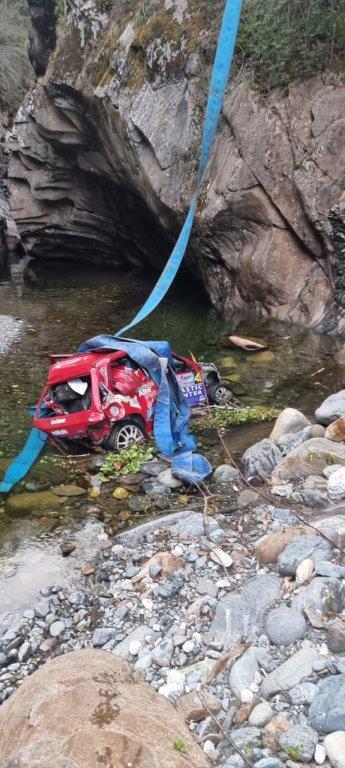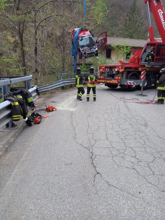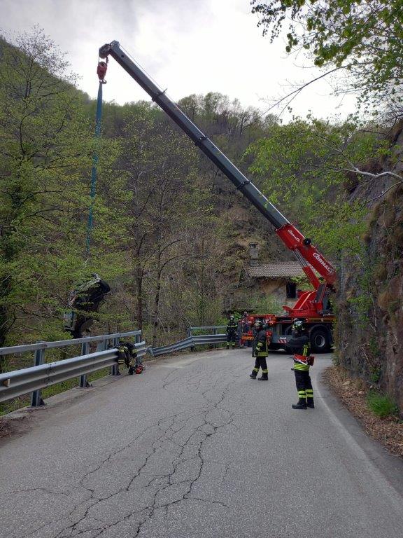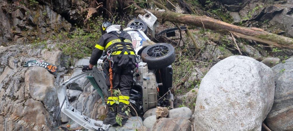 VAL CANNOBINA - 26-04-2021 - Intervento dei Vigili del Fuoco in valle Cannobina per il recupero delle due autovetture uscite fuori strada durante una prova del rally delle Valli Ossolane.