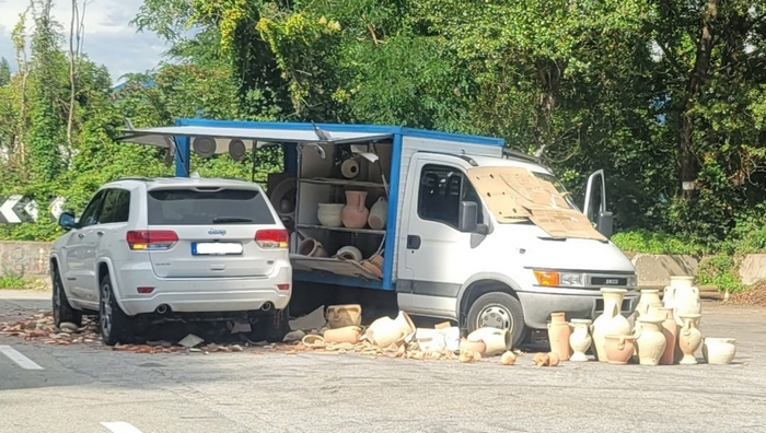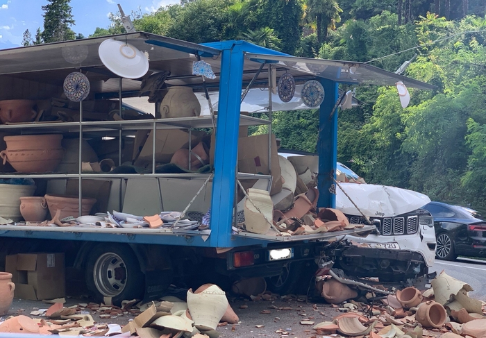 GHIFFA - 16-07-2021 -- Un veicolo semidistrutto e cocci dappertutto. È questo il bilancio dell’incidente stradale accaduto verso le 19 di oggi sulla statale 34 del Lago Maggiore, tra Ghiffa e Oggebbio. A bordo strada, lato lago, era posteggiato il camion di un venditore ambulante di vasi la cui merce era in parte esposta nel piazzale/parcheggio, al di fuori della carreggiata. Proveniente da Verbania e diretta a Cannobio è sopraggiunta una Jeep di un automobilista tedesco che, sorprendentemente, ha centrato lo spigolo posteriore destro del camion. Nell’impatto il suv ha riportato ingenti danni, non di meno li ha patiti l’ambulante, che ha visto andare in frantumi decine di vasi. Il sinistro è stato rilevato dai carabinieri.