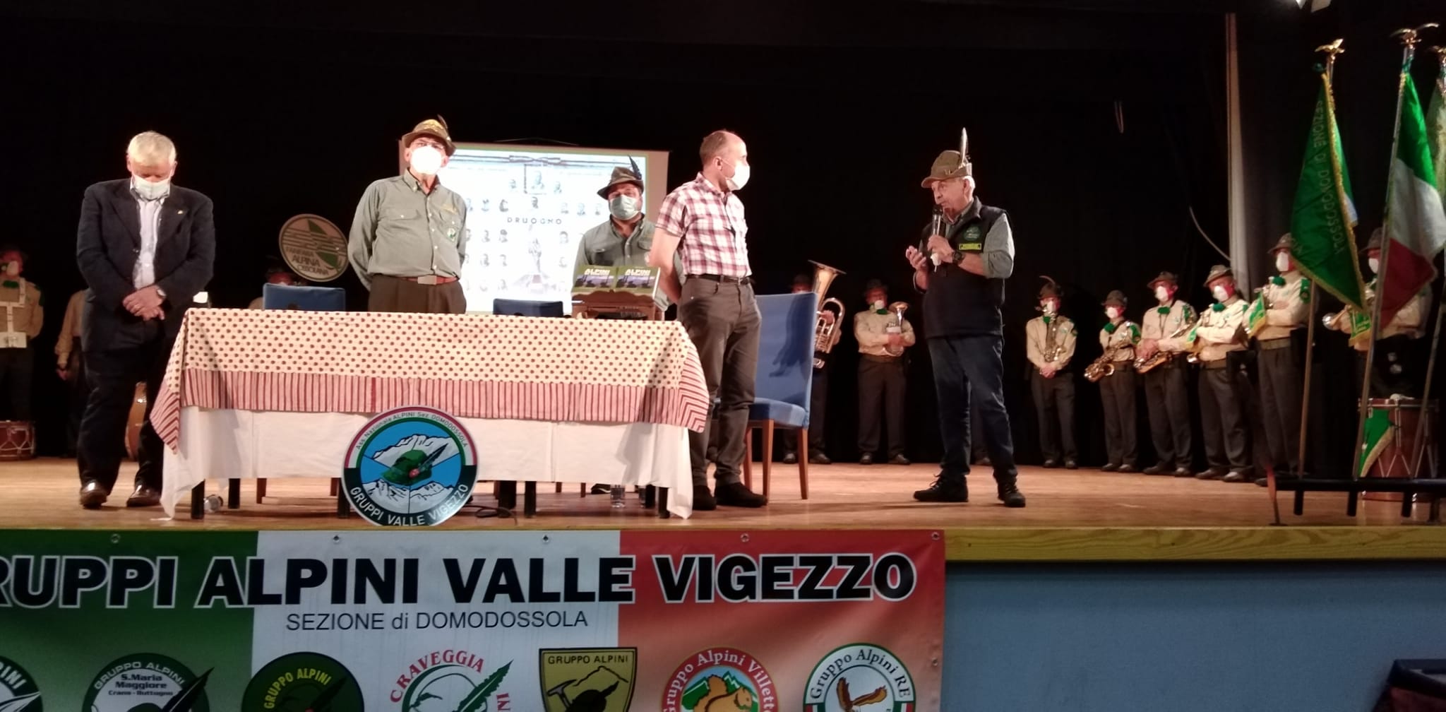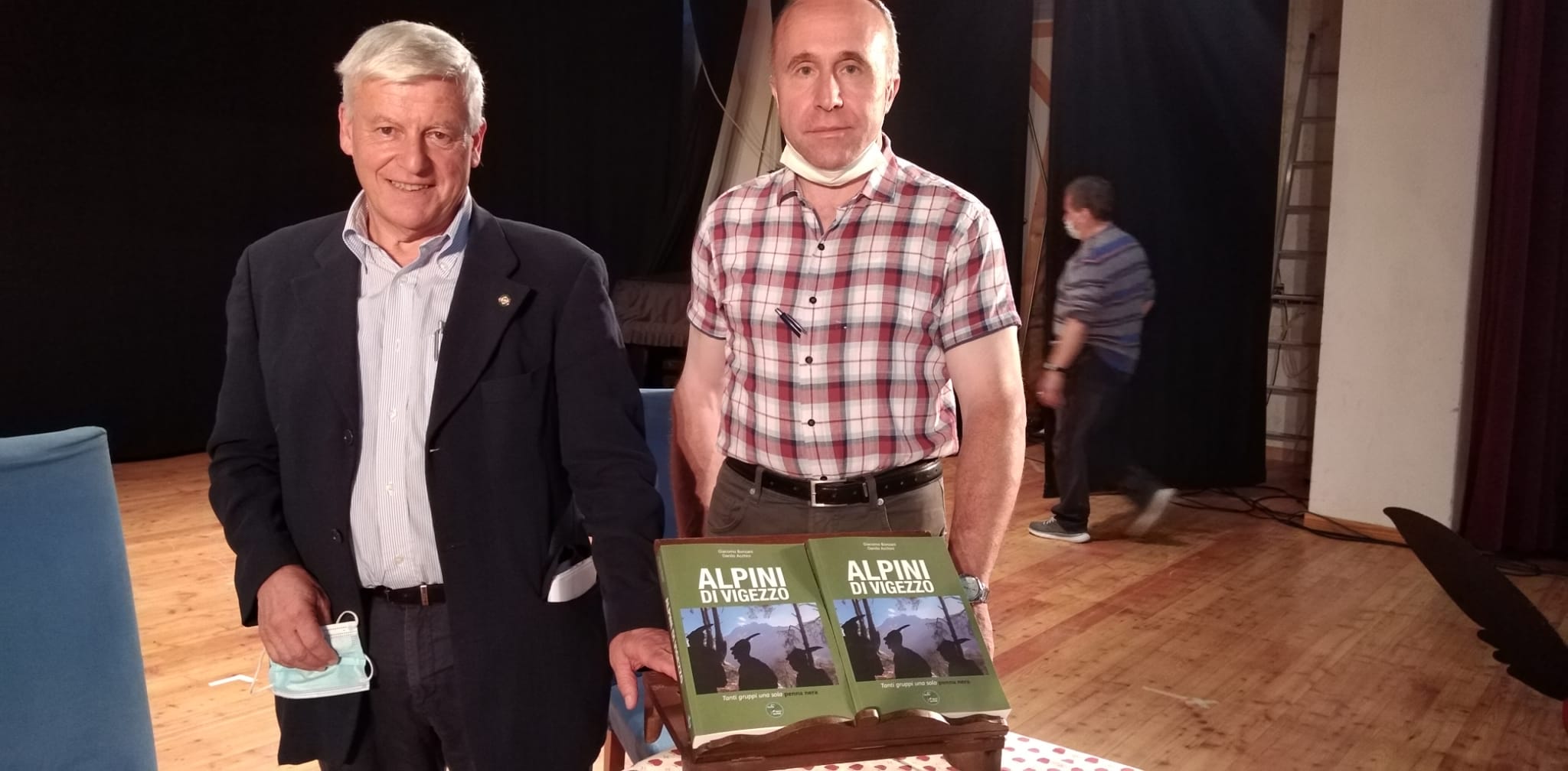 VIGEZZO- 01-08-2021-- I Gruppi Alpini della Valle Vigezzo hanno presentato ieri sera presso il teatro di Santa Maria Maggiore il libro di Giacomo Bonzani e Danilo Acchini "Alpini di Vigezzo. Tanti gruppi una sola penna". Si tratta del primo libro che racconta la storia di tutti i gruppi vigezzini ( alcuni singoli gruppi si erano giĆ dotati di una bibliografia ma non vi era ancora un lavoro completo per tutta la valle), supportato da una sezione iconografica di grande importanza storica, dalle foto della Grande Guerra scattate da chi era al fronte sino a dare un volto ai Caduti ricordati nei monumenti dei vari Comuni.