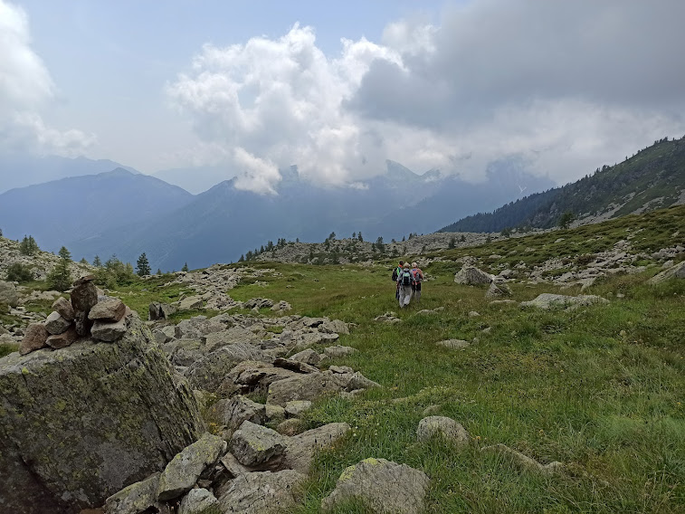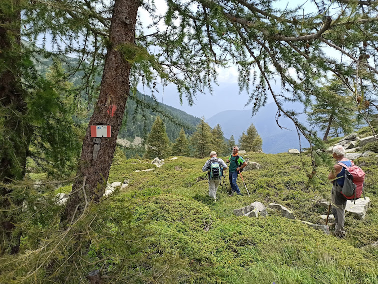 Ci troviamo al Ponte di Mocogna e questa volta il meteorologo ufficiale conferma la destinazione “Alta Val Bognanco” e la modalità “ombrelli in auto”. Qualche nuvola vagante non ci creerà problemi, se non sulla Costa del Dente, quando un momento di scarsa visibilità favorirà il nostro errore. Quattro anziani, con un adeguato staff medico, salgono in auto al grande parcheggio di San Bernardo, 1630. Oggi, ahimè, mancano le signore e non è la prima volta (altro “ahimè”) che mi trovo ad essere il più anziano del gruppo. Devo cominciare a preoccuparmi?